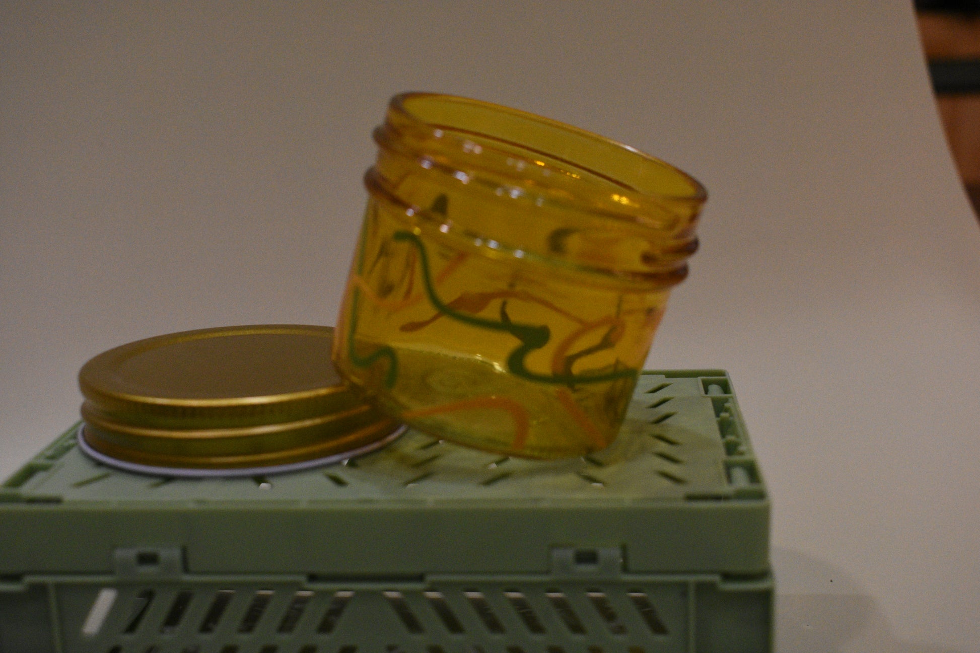 gold lid 4 oz. jar with green & yellow design elements